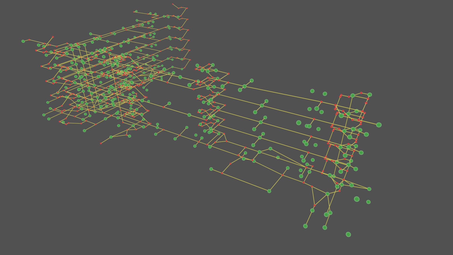 In Blender heb ik ook het 'node netwerk' van 2 gebouwen uitgetekend. Dit zijn alle mogelijke loop routes door het gebouw heen. Met de python api wordt dit node netwerk geëxporteert naar een json bestand, wat later door de server gebruikt kan worden een route te berekenen.